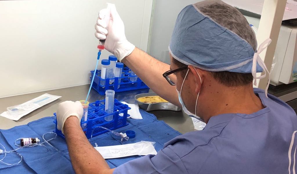 The patient underwent arthroscopic microfracture and autologous bone marrow-derived MSCs implantation following Fulkerson osteotomy. Surgical procedures included lateral retinaculum release and tibial tubercle realignment to stabilize the patella.
